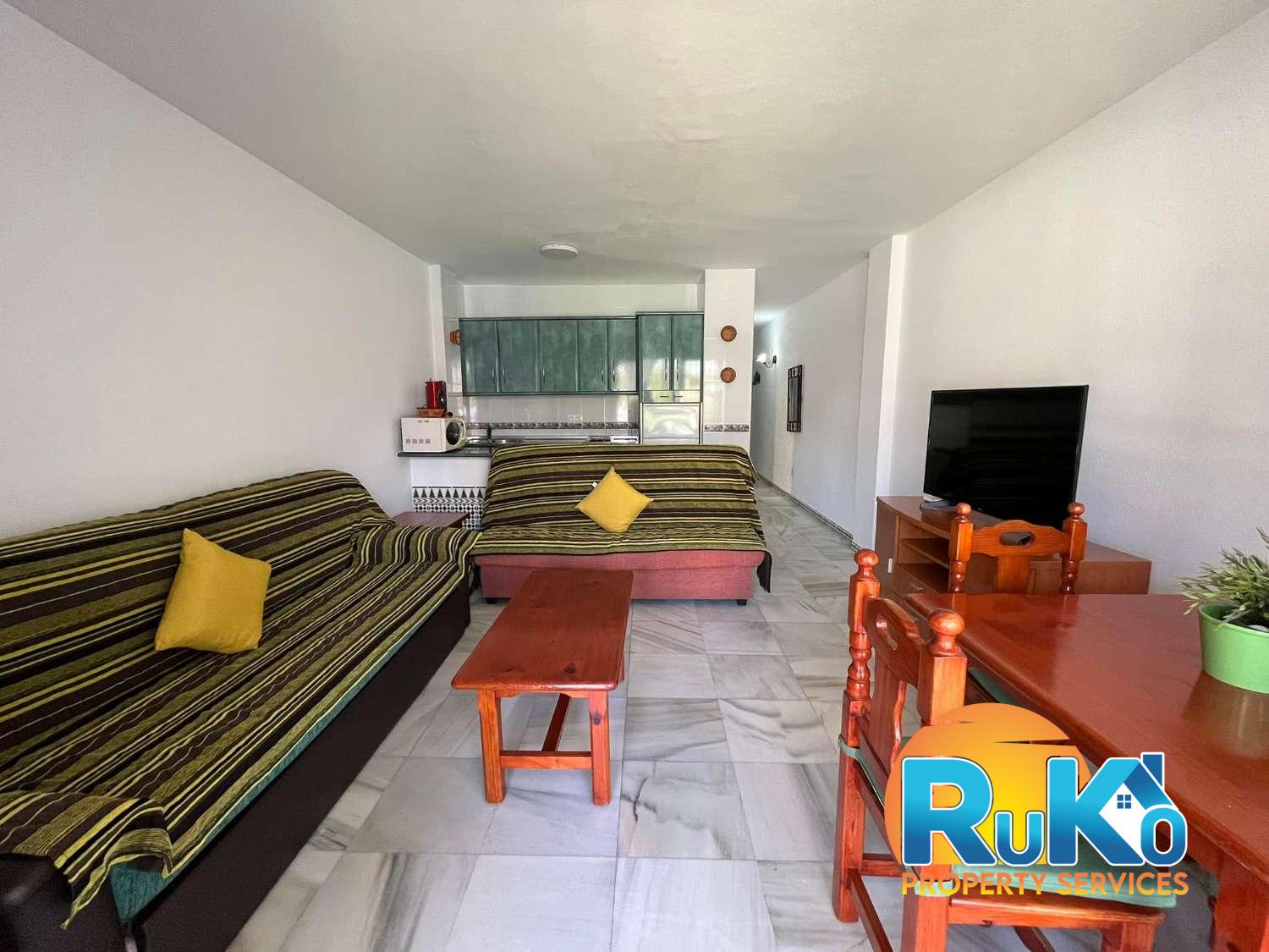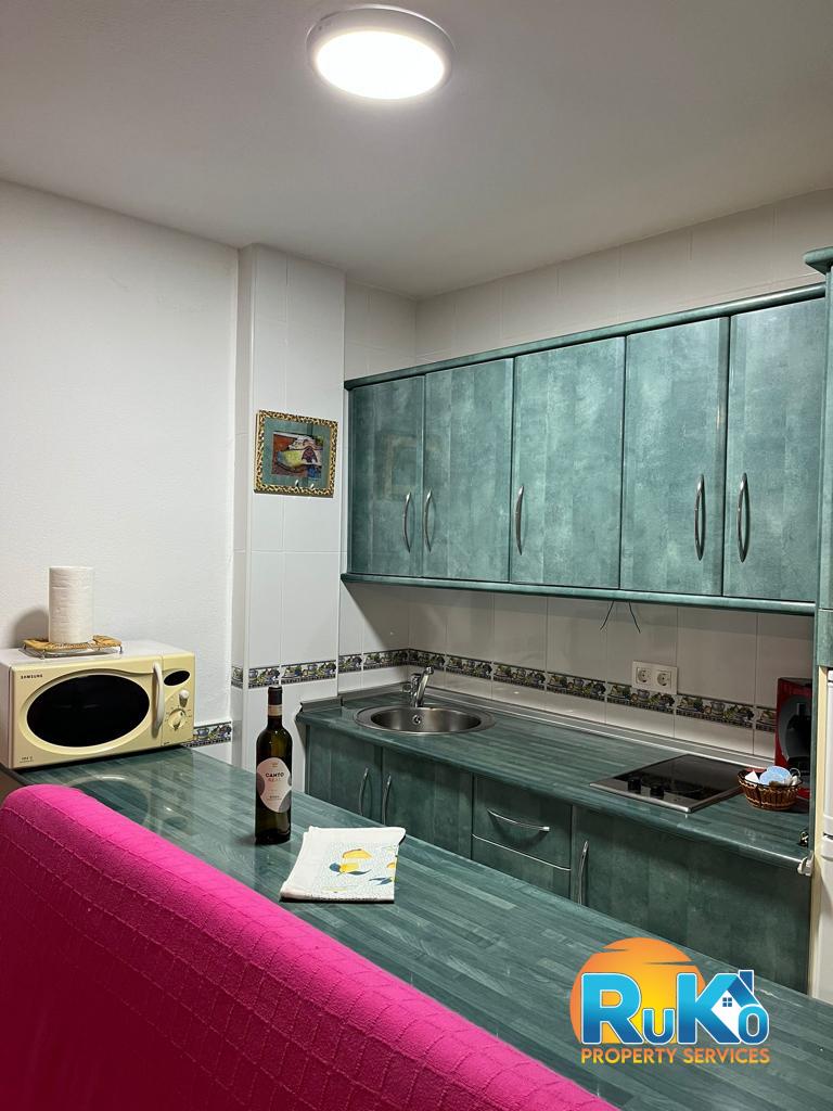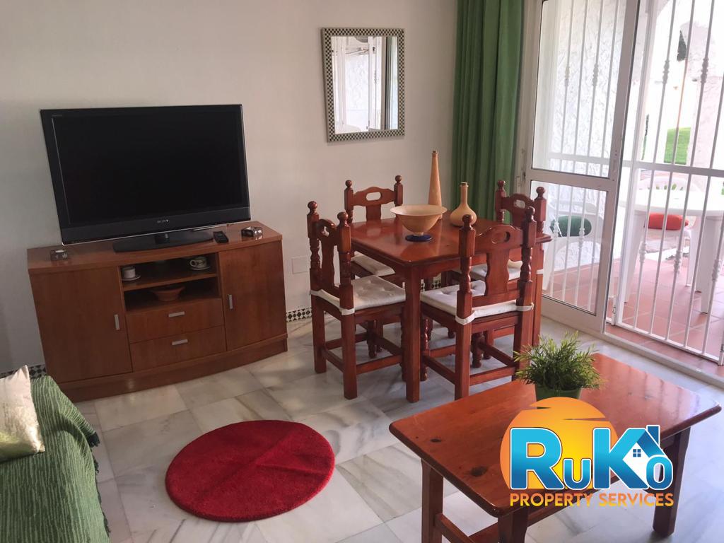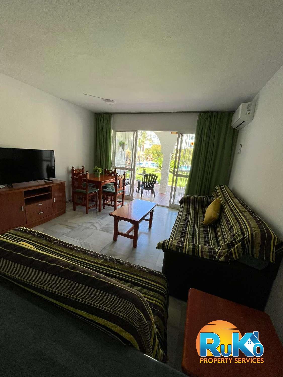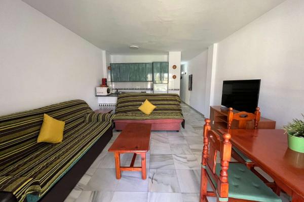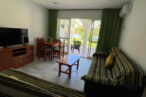 Apartamento en planta baja, consta de un dormitorio y dos sofás camas, capacidad para 4 o 5 personas, cocina con barra americana, pequeña terraza que da directamente a zonas verdes y piscina comunitaria, tiene aire acondicionado en el solón y wiffi. A 1 minuto de la playa el playazo